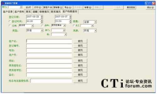 注:對(duì)于登記日期一直到客戶名這一段條件的查詢(即上圖中所有的那些查詢條件),都得點(diǎn)擊客戶名欄對(duì)應(yīng)的那個(gè)查找按鈕才能進(jìn)行有效的查找,否則若點(diǎn)擊其它按鈕(姓名電話直接檢索對(duì)應(yīng)的查找除外),都會(huì)提示“請(qǐng)輸入****”這種錯(cuò)誤信息。而點(diǎn)擊最后一個(gè)查找,也是無效的,會(huì)轉(zhuǎn)到客戶管理中空白信息欄(即什么也查不到)。
