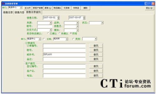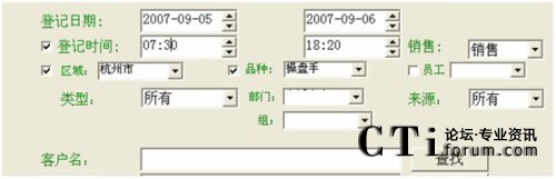 例子:查找2007年9月5日到2007年9月6日間,登記時(shí)間為早上7:30到晚上18:20,購買了操盤手軟件的杭州市顧客的查找設(shè)置如下: