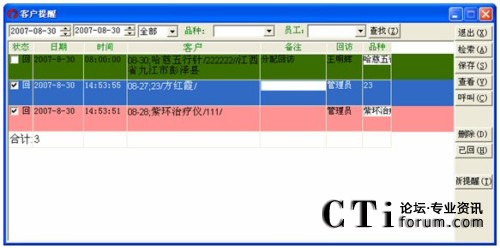 對(duì)于已經(jīng)回訪過的提醒,選定它并單擊已回,這樣它的狀態(tài)就會(huì)標(biāo)記為已回,再單擊一下查找,則剛才設(shè)定為已回的提醒,記錄的顏色變?yōu)榉奂t。
