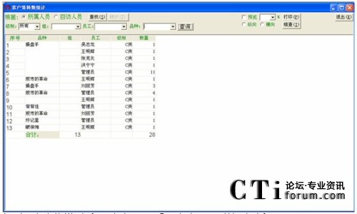 可以對(duì)進(jìn)線進(jìn)行日統(tǒng)計(jì)、周統(tǒng)計(jì)、月統(tǒng)計(jì)、季度統(tǒng)計(jì)、年度統(tǒng)計(jì),并分別可對(duì)部門、員工、品種等進(jìn)行組合式的查詢。