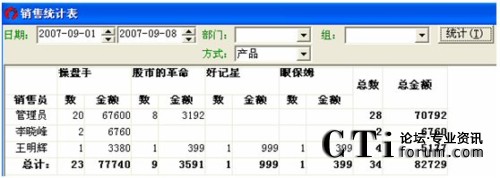 可按部門或者是方式(方式中有產(chǎn)品跟排行兩種查詢條件)來統(tǒng)計(jì)銷售信息。
