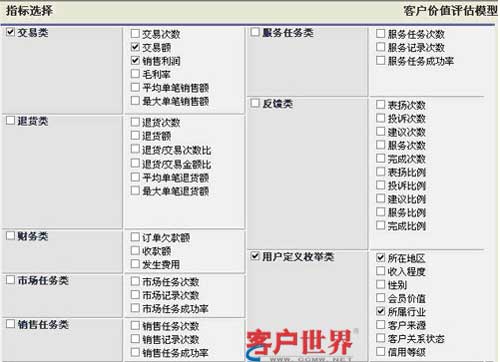TurboCRM在長期支持CRM應(yīng)用實(shí)踐過程中,總結(jié)出一套完整實(shí)用的客戶價值評估模型,評估指標(biāo)包括交易類、財務(wù)類、服務(wù)類、反饋類、枚舉類、自定義指標(biāo)等(如圖),結(jié)合不同的指標(biāo)可以幫助企業(yè)評估客戶價值。