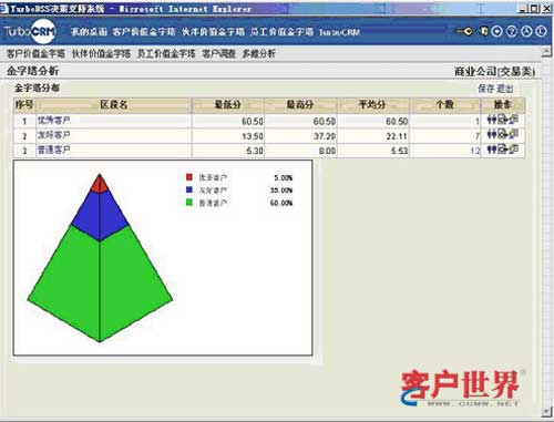 根據(jù)預(yù)先設(shè)定的客戶價值評估模型,CRM會自動計算出每個客戶的價值得分以及對應(yīng)到不同等級的客戶價值,并會記錄到客戶項(xiàng)下,便于業(yè)務(wù)人員在與客戶接觸時,直觀了解客戶價值情況。客戶價值金字塔分析(如圖),可以動態(tài)的了解各類客戶的價值分布。
