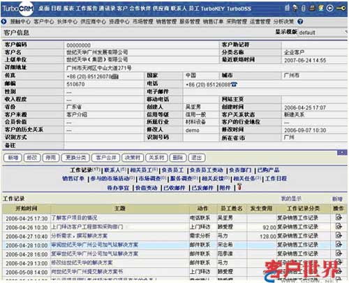 信息整合是CRM系統(tǒng)實(shí)現(xiàn)對客戶信息進(jìn)行管理的基礎(chǔ),將客戶的各類信息進(jìn)行關(guān)聯(lián),當(dāng)查詢某個客戶時,與該客戶相關(guān)的歷史接觸記錄、交易記錄都可一目了然地展現(xiàn)出來,也可以方便地進(jìn)行相關(guān)信息的及時錄入。(如下圖)