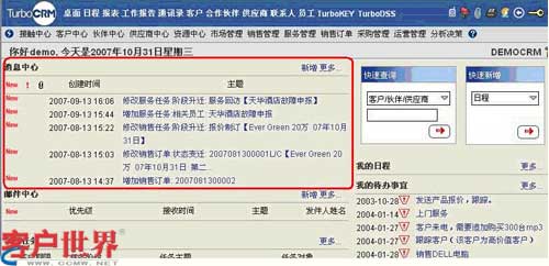 TurboCRM系統(tǒng)的消息中心是協(xié)同工作的核心,當(dāng)客戶接觸過程有進(jìn)展時,相關(guān)員工的桌面會出現(xiàn)消息提醒,以方便員工及時地了解客戶動態(tài)。