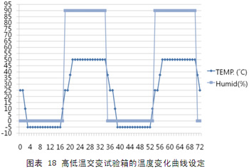 如圖表18所示,在72小時的測試中,以36小時為周期,溫濕度將變化兩個循環(huán)。每個循環(huán)中都要在比較極端的兩種溫度環(huán)境:零下5攝氏度,0%濕度;以及50攝氏度,90%濕度下各工作13個小時。