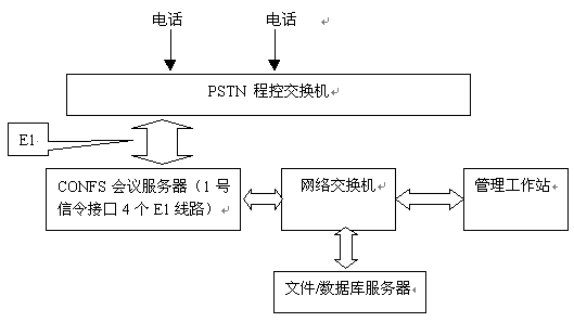 系統(tǒng)主要由網(wǎng)絡、數(shù)據(jù)庫服務器(DBS)、會議服務器(CONFS)、管理工作站幾個部分組成。數(shù)據(jù)庫服務器主要負責數(shù)據(jù)的存儲,而CONFS完成電話話路的接入與會議控制,彼此之間相輔相承。如圖所示: