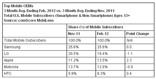 按截至今年2月份的三個(gè)月的平均數(shù)計(jì)算,美國(guó)13歲以上的手機(jī)用戶數(shù)為2.34億。三星名列手機(jī)原始設(shè)備制造商之首,占有美國(guó)手機(jī)市場(chǎng)25.6%的份額;LG電子名列第二,占有19.4%的市場(chǎng)份額;蘋(píng)果排名第三,占有13.5%的市場(chǎng)份額(上升2.3個(gè)百分點(diǎn));摩托羅拉排名第四,占有12.8的市場(chǎng)份額;HTC排名上升至第五,占有6.3%的市場(chǎng)份額(上升0.4個(gè)百分點(diǎn))。