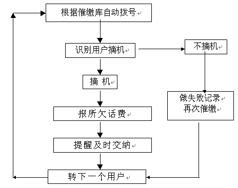 催費(fèi)工作是由指定的欠費(fèi)數(shù)據(jù)文件(或欠費(fèi)數(shù)據(jù)庫(kù))中提取用戶手機(jī)號(hào)碼和欠費(fèi)金額,自動(dòng)順序向各欠費(fèi)用戶撥號(hào),撥通后自動(dòng)播放催費(fèi)通知并通報(bào)欠費(fèi)金額數(shù)。系統(tǒng)自動(dòng)統(tǒng)計(jì)通話結(jié)果,系統(tǒng)對(duì)未應(yīng)答用戶會(huì)自動(dòng)重復(fù)多次撥叫。
