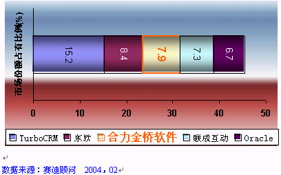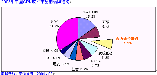 2004年2月10日,北京。賽迪顧問(CCID Consulting )在中國大飯店隆重舉辦了"2004IT市場年會(huì)", 會(huì)上發(fā)布了《2003-2004年中國管理軟件產(chǎn)業(yè)投資機(jī)會(huì)研究年度報(bào)告》。HOLLYCRM(合力金橋軟件)公司在強(qiáng)手如林的評選中憑借其強(qiáng)勁的市場占有份額、深厚的品牌實(shí)力及出眾的用戶美譽(yù)度無可爭議地穩(wěn)居2003年度中國CRM軟件整體市場份額前三甲, 同時(shí)更奪得了2003年度中國電信行業(yè)CRM市場份額龍頭位置。