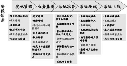 根據(jù)產(chǎn)品選型的結(jié)果和選定的系統(tǒng)集成商,由甲乙雙方人員組成項(xiàng)目組,對項(xiàng)目進(jìn)行實(shí)施。此階段最容易出現(xiàn)各種問題,如果處理不好,很可能導(dǎo)致呼叫中心的建設(shè)失敗。這個(gè)環(huán)節(jié)很重要的一點(diǎn)就是系統(tǒng)集成商是否有成熟的實(shí)施方法論來指導(dǎo)項(xiàng)目的實(shí)施,降低項(xiàng)目實(shí)施中的風(fēng)險(xiǎn),確保項(xiàng)目能順利實(shí)施。圖4是HOLLYCRM公司項(xiàng)目實(shí)施方法論的一個(gè)概貌,可供大家參考。