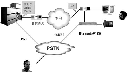 在iRemote遠(yuǎn)端坐席實(shí)現(xiàn)方式中,系統(tǒng)采用的遠(yuǎn)端語音模塊iRemote9150由安裝在M1內(nèi)的MIG RLC卡板和遠(yuǎn)端單元iRemote9150組成。MIG RLC卡板通過10BASE-T以太網(wǎng)接口與路由器相連。iRemote單元既可通過10BASE-T以太網(wǎng)接口與路由器相連,也可以以ISDN BRI方式與PSTN相連,每個(gè)遠(yuǎn)端單元最多提供4個(gè)BRI接口,32個(gè)數(shù)字話機(jī)接口,一個(gè)用于傳真的模擬端口。每塊MIG RLC卡板有一DSP模塊,可同時(shí)處理8路語音,通過在MIGLC板上增加3塊DSP模塊,最多可同時(shí)處理32路話音。IP網(wǎng)上的話音符合UDP/IP協(xié)議,話機(jī)狀態(tài)控制信號(hào)符合TCP/IP協(xié)議。同一遠(yuǎn)端單元間的兩用戶通話無需占用M1帶寬。