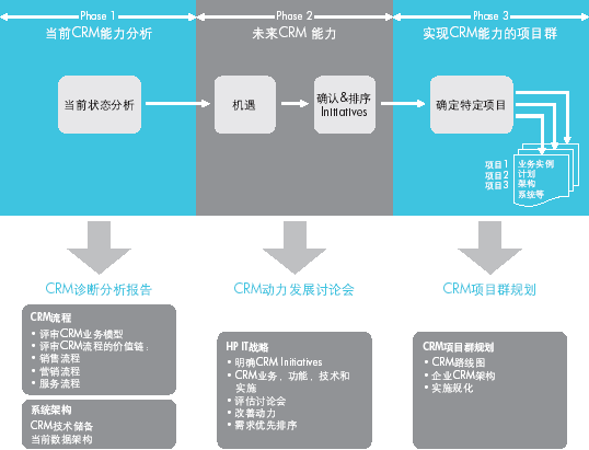 本階段,HP將指導(dǎo)客戶進(jìn)行未來(lái)CRM能力的開(kāi)發(fā),具體操作由HP的CRM專家通過(guò)一系列的workshop來(lái)完成。