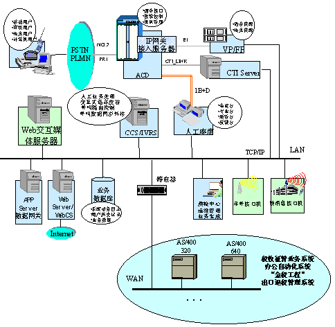 在深圳國稅局方案中,整個系統(tǒng)的建設(shè)按三期規(guī)劃進(jìn)行。第一期的目標(biāo)主要是搭建呼叫中心平臺,包括ACD(排隊(duì)機(jī))、IVR(交互式語音應(yīng)答系統(tǒng))、CCS(華為呼叫中心中間件)等軟硬件設(shè)備。ACD作為整個系統(tǒng)的核心接入設(shè)備,采用了華為公司的C&C08-Q排隊(duì)機(jī)。C&C08-Q是大容量高可靠性的數(shù)字排隊(duì)機(jī),通過中國七號信令或ISDN