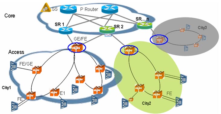 綜合接入主要關(guān)注語(yǔ)音和少量寬帶業(yè)務(wù)和專線,上行接口一般是E1和FE/GE。傳統(tǒng)窄帶語(yǔ)音業(yè)務(wù)、TDM專線等或MSAN使用于窄帶交換機(jī)組網(wǎng)的時(shí)候采用E1上行方式,其它時(shí)候采用FE/GE上行。接入層面采用的承載網(wǎng)設(shè)備必須同時(shí)能夠支持E1和FE/GE接入,因此承載網(wǎng)設(shè)備必須具備多業(yè)務(wù)傳輸特性,傳統(tǒng)SDH設(shè)備,傳統(tǒng)LANSwitch設(shè)備無(wú)法滿足組網(wǎng)需求。