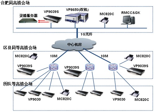 為滿足安徽省煙草合肥市公司日常工作會(huì)議、集中培訓(xùn)、遠(yuǎn)程匯報(bào)等工作業(yè)務(wù)需求,同時(shí)為應(yīng)對(duì)突發(fā)事件提供可靠可行的交互平臺(tái),實(shí)現(xiàn)多地點(diǎn)、遠(yuǎn)距離的視頻、音頻和數(shù)據(jù)的互通交流。深圳市金華威數(shù)碼科技有限公司工程師建議新建的視訊系統(tǒng)采用高清的視頻會(huì)議組網(wǎng)模式,其中市局、三縣與區(qū)局、所隊(duì)及營銷部所有會(huì)場節(jié)點(diǎn)建設(shè)高清視頻會(huì)議系統(tǒng)。