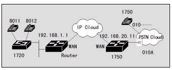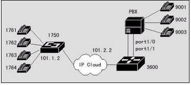 在該案例中,異地之間通過(guò)兩臺(tái)DCR 1750互連,并提供語(yǔ)音模塊,可直接接電話機(jī),使得異地之間可以通過(guò)IP網(wǎng)絡(luò)撥打IP語(yǔ)音電話。