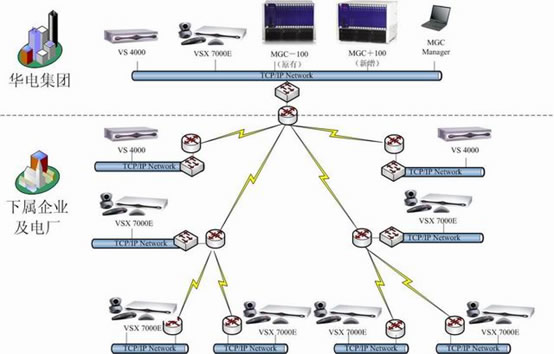 華電集團(tuán)領(lǐng)導(dǎo)十分重視電力信息化及華電集團(tuán)電子政務(wù)的建設(shè)工作。為了貫徹國務(wù)院對政府系統(tǒng)信息化建設(shè)的要求,實(shí)現(xiàn)華電集團(tuán)政務(wù)辦公和行業(yè)管理信息服務(wù)的電子化、網(wǎng)絡(luò)化,滿足華電集團(tuán)建立辦事高效、運(yùn)轉(zhuǎn)協(xié)調(diào)、行為規(guī)范的行政管理體制的要求,加快推進(jìn)電力行業(yè)信息化建設(shè),華電集團(tuán)決定開展華電集團(tuán)信息化建設(shè)二期工程建設(shè),即在現(xiàn)有的基礎(chǔ)上再增加一臺MCU以及在下屬企業(yè)及電廠增加37臺終端。鑒于POLYCOM在視頻會議強(qiáng)大的技術(shù)優(yōu)勢以及神州數(shù)碼在視頻會議系統(tǒng)建設(shè)和實(shí)施上的雄厚實(shí)力和豐富經(jīng)驗(yàn),華電集團(tuán)決定包括MCU和終端的所有設(shè)備都采用POLYCOM的產(chǎn)品。整個(gè)系統(tǒng)主要建立在華電集團(tuán)現(xiàn)有的視頻會議的基礎(chǔ)之上,依據(jù)H.323標(biāo)準(zhǔn)協(xié)議建設(shè)視頻會議系統(tǒng)二期組網(wǎng)。其中,控制中心新增一臺POLYCOM公司的MGC+100多點(diǎn)控制單元(即MCU);POLYCOM 高性能的VSX7000E作為下屬企業(yè)及電廠主接點(diǎn)視頻會議終端。