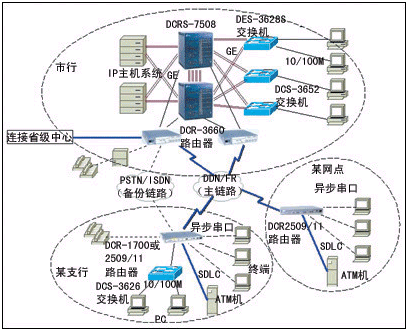 對(duì)于業(yè)務(wù)比較少的網(wǎng)點(diǎn),使用DCR-2501或DCR-2509路由器;對(duì)于業(yè)務(wù)比較多的網(wǎng)點(diǎn),使用DCR-2511或DCR-1720或DCR-1750路由器。營(yíng)業(yè)網(wǎng)點(diǎn)使用DCR-2500或1700系列路由器,既實(shí)現(xiàn)柜員終端、IP業(yè)務(wù)等綜合業(yè)務(wù)接入,又能用以太口將辦公網(wǎng)絡(luò)連接起來(lái),實(shí)現(xiàn)真正的綜合業(yè)務(wù)接入。原有遠(yuǎn)程終端可以直接連在DCR-2500或1700系列路由器上,通過(guò)IP網(wǎng)絡(luò)訪問(wèn)網(wǎng)絡(luò)內(nèi)任意位置的業(yè)務(wù)前置機(jī),無(wú)須改動(dòng)原有業(yè)務(wù)軟件,輕松實(shí)現(xiàn)銀行綜合業(yè)務(wù)。終端通過(guò)上述路由器可訪問(wèn)支行和分行不同局域網(wǎng)上的多臺(tái)前置機(jī),訪問(wèn)時(shí),不需要調(diào)用前置機(jī)的TELNET服務(wù),且終端號(hào)固定。
