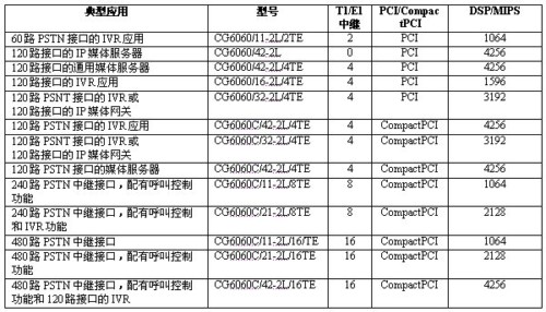 Call ControlTM(NCC)。CG 6060 PCI板卡和CG 6060C CompactPCI板卡是研制經(jīng)濟型應用系統(tǒng)的理想選擇,可研制的應用系統(tǒng)類型包括:媒體服務(wù)器、增強服務(wù)平臺、IVR、會議應用、消息處理、IP集中交換解決方案等。