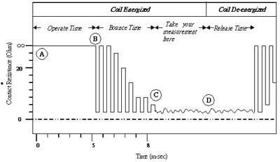 2) Bounce Time: 繼電器第一次閉合直至開(kāi)關(guān)彈跳(Bounce)結(jié)束的時(shí)間,為B-C區(qū)段。
