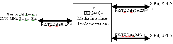 下圖是使用Intel IPX2400的范例,說明規(guī)劃時(shí)可能要處理的一些接口。請注意,許多網(wǎng)絡(luò)處理器允許接口被設(shè)定成可支持多種不同的傳輸,以下只是其中一種可能的設(shè)定范例。