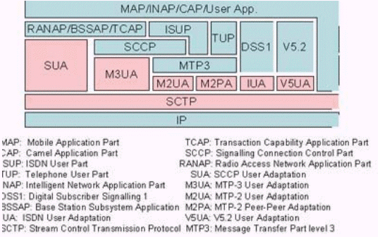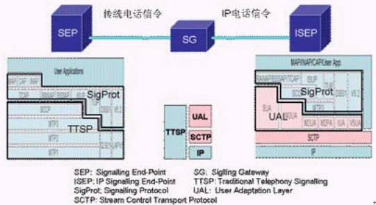 圖中粉紅色部分為SIGTRAN的協(xié)議棧,在它們之上的是對應(yīng)的電話信令協(xié)議。SIGTRAN的協(xié)議棧分為2層:一層是SCTP,它提供多個流的,可靠的數(shù)據(jù)傳輸,用戶數(shù)據(jù)的捆綁和分段,阻塞和流量控制,防止"拒絕服務(wù)"和"偽裝"的攻擊等功能。另一層是用戶適配層,圖中由SUA、M3UA、M2UA、M2PA、IUA和V5UA五個適配模塊所組成,它們分別來滿足各種電話信令協(xié)議適配的要求。