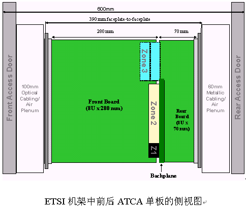 PICMG 3.0機(jī)構(gòu)要求主要來自于對600mm ETSI 和19" EIA標(biāo)準(zhǔn)機(jī)柜空間使用的研究。PICMG 3.0委員會在考慮單板尺寸能支持下一代元器件對物理和散熱的需求的同時,機(jī)箱空間能和板子能達(dá)到最大限度的配合和利用。最初的工作是基于歐規(guī)卡的標(biāo)準(zhǔn),繼而又提升到支持低成本的片狀金屬架構(gòu)(簡單電訊封裝)。對后走線模塊的支持滿足了對后I/O應(yīng)用的需求。在決定可以使用的單板空間時,也充分考慮了前、后板的進(jìn)深范圍以供大量電纜束綁空間。經(jīng)過對不同規(guī)格尺寸的單板的優(yōu)點(diǎn)進(jìn)行討論之后,PICMG 3.0組織統(tǒng)一規(guī)格如下:前板 8U x 280mm,進(jìn)深1.2" pitch,選配后板8U x 70mm深;1.2" pitch,19" EIA機(jī)框可以支持14槽,而600mm ETSI的機(jī)框可以支持16槽。下圖所示為600mm ETSI機(jī)架中的ACTA前后單板的側(cè)視圖: