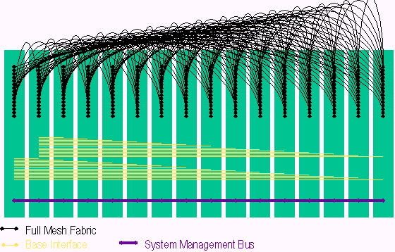 PICMG 3.0包含多種傳輸,這些傳輸模式如圖由下而上依序提供系統(tǒng)管理層、控制層、資料層等的聯(lián)接。系統(tǒng)管理是基于一條與各槽位都相連的I2C 雙串行信號線, 系統(tǒng)管理信息則是基于IPMI規(guī)范被擴(kuò)展到在PICMG3.0規(guī)范中使用。系統(tǒng)管理總線也是冗余方式確保在一條總線故障情況下,管理信息仍正常傳遞。在資料層旁邊的控制層稱作Base 接口 (Base Interface),Base接口是一個雙星型的拓?fù)浣Y(jié)構(gòu)具有冗余的交換刀片和以太網(wǎng)BAST-T信號,在PICMG 3.0中提供IP傳輸,這點(diǎn)在架構(gòu)定義上非常像PICMG 2.16。PICMG 3.0單板的高速數(shù)據(jù)傳輸是通過Fabric接口 (Fabric Interface),F(xiàn)abric接口是基于3.125Gbps SERDES信號,可以在星型和全網(wǎng)狀結(jié)構(gòu)中支持10Gb的傳輸速率。正如上面提到的,PICMG 3.0核心規(guī)范定義了Fabric接口的信號和互聯(lián),而輔助規(guī)范定義了用于傳輸?shù)膮f(xié)議。PICMG 3.0 背板的互聯(lián)支持全網(wǎng)狀Fabric接口,雙星型Base接口和冗余的系統(tǒng)管理,如下圖所示: