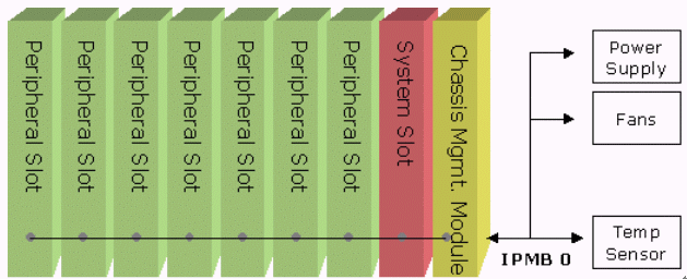 - 標(biāo)準(zhǔn)型IPMI系統(tǒng):利用背板上的IPMB總線,在系統(tǒng)槽上的CompactPCI單板上設(shè)計(jì)一顆BMC的控制器,其余在PCI插槽上的外圍片只要存在簡單的IPMI命令兼容的控制器,系統(tǒng)槽的單板即可透過IPMB讀取所有外圍片的狀態(tài),然后再經(jīng)由序列或是網(wǎng)絡(luò)的形式通知系統(tǒng)管理者。