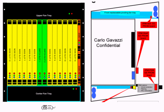 我們可以看到當(dāng)今市面上已有相關(guān)的零件商或系統(tǒng)商開(kāi)發(fā)出14U或13U,12U的ATCA機(jī)箱。就ATCA機(jī)箱的型式來(lái)說(shuō)可以分為直立型插卡與橫向型插卡兩種類型。直立式插卡機(jī)箱的標(biāo)準(zhǔn)為14槽(參考圖一B),而橫向型機(jī)箱因受限于機(jī)箱高度,所以視其高度決定槽數(shù)的多少。 ATCA的架構(gòu)主要包括以下部分:正面插槽,RTM,PEM,背板,CMMs,散熱系統(tǒng)。(參考圖一與圖二)
