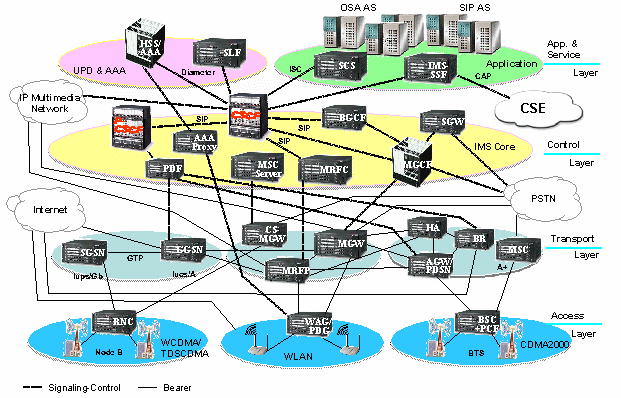 控制層是由以IMS為核心的所有控制部分所組成。IMS獨(dú)立于接入技術(shù),是3G"家族"公用的。IMS基于IP技術(shù),支持語(yǔ)音、視頻、文字、數(shù)據(jù)等業(yè)務(wù)以及這些業(yè)務(wù)的組合,支持IPv6和QoS,支持開(kāi)放的業(yè)務(wù)接口。該層還包括如MSC服務(wù)器,信令網(wǎng)關(guān)等設(shè)備。