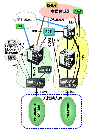 PDS采用MIP技術(shù),是支持多媒體的和傳統(tǒng)的移動(dòng)數(shù)據(jù)業(yè)務(wù)的網(wǎng)絡(luò)。AGW包括PDSN以及其他一些所需要的功能,提供了對(duì)各種接入網(wǎng)絡(luò)的公共接口。它提供移動(dòng)IP登記和鑒權(quán),支持外部代理(FA)和分組數(shù)據(jù)傳輸,切換、AAA客戶(hù)端、QoS管理和策略執(zhí)行等功能。歸屬代理(HA)主要完成用戶(hù)當(dāng)前附著點(diǎn)的登記和用戶(hù)IP包的前轉(zhuǎn)兩大功能。