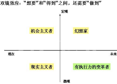 第二種左上角是“機(jī)會(huì)主義者”,既有宏觀的視角,又注重當(dāng)前的機(jī)會(huì),然而遺憾的是往往這樣缺乏足夠的前瞻性,抓住了眼前的機(jī)會(huì),卻錯(cuò)失了未來(lái)的藍(lán)圖和方向。