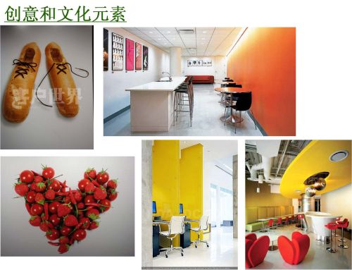 左下邊的這個(gè)圖是我自己非常喜歡的,就是在一個(gè)咖啡館里面,用一些番茄、一些小的辣椒和一些草莓搭成這樣一個(gè)形狀。上面大家看是鞋子,其實(shí)是兩塊面包把中間挖空了,鞋帶是巧克力,用這種方式來(lái)調(diào)動(dòng)別人在咖啡館里面的食欲。我們?cè)谠?huà)房里面是一樣的,要讓客服代表,特別是那個(gè)年齡段20-25歲之間年輕的男孩子和女孩子們喜歡,甚至他們有一種重回學(xué)校的感覺(jué)都可以。所以這里面不用花太多的心思可以有很好的創(chuàng)意。在這個(gè)話(huà)房的設(shè)計(jì)當(dāng)中,覺(jué)得從環(huán)境的角度和自己能夠著手去改變的角度來(lái)看,已經(jīng)可以把你得話(huà)房做出自己的特色,就像我們?cè)谧约杭依镅b修一樣,可以有不同的色彩,也可以由不同的結(jié)構(gòu),當(dāng)然需要滿(mǎn)足公司給你預(yù)算的要求。