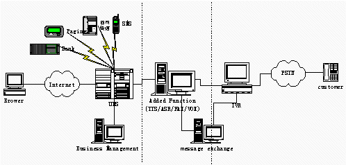 傳統(tǒng)UMS的分散的網(wǎng)民,而IVR, UMS服務(wù)提供商的客戶是企業(yè),系統(tǒng)的使用者則是企業(yè)的客戶(即系統(tǒng)面向下家,由下家為最終客戶提供服務(wù)),分離的模式可以有兩個(gè)獨(dú)立的企業(yè)來運(yùn)營(yíng)系統(tǒng),IVR Service由具有電信資源的企業(yè)(如:具有接入號(hào),有電信中繼資源,還有CTI系統(tǒng)建設(shè)經(jīng)驗(yàn))運(yùn)營(yíng)。UMS Service由ISP企業(yè),網(wǎng)站門戶企業(yè)等在互聯(lián)網(wǎng)絡(luò)有建設(shè)經(jīng)驗(yàn)的企業(yè)運(yùn)營(yíng)。兩家企業(yè)密切合作。共同提供完善的統(tǒng)一的信息服務(wù)。