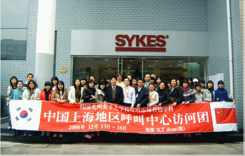 2006年12月14日上午,韓國光州女子大學呼叫市場營銷系30多名大學學生 在鄭成教授等的帶領下,專程來滬參觀訪問賽科斯(Sykes)公司。韓國光州女子大學是韓國第一個設立呼叫市場營銷專業(yè)的大學,該專業(yè)為四年制本科,學生畢業(yè)后主要從事客戶服務行業(yè)的基層管理崗位工作。