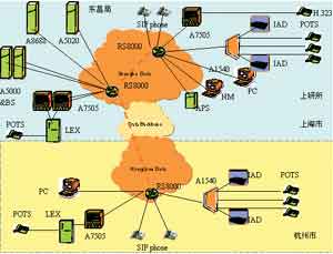 杭州秋濤局配置的是A7505中繼網(wǎng)關(guān)、A1540接入網(wǎng)關(guān)以及其他的綜合接入設(shè)備、SIP終端、H.323終端等。A7505同當(dāng)?shù)亟粨Q機(jī)配合可以經(jīng)由IP骨干網(wǎng)實(shí)現(xiàn)上海到杭州的長途語音業(yè)務(wù)。A1540及經(jīng)由它的ST700可以實(shí)現(xiàn)NGN的語音數(shù)據(jù)業(yè)務(wù)。杭州到上海的連接是通過中國電信的IP骨干網(wǎng)實(shí)現(xiàn)的。