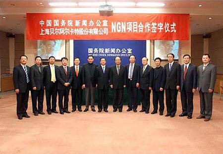 中國國務(wù)院新聞辦公室和上海貝爾阿爾卡特股份有限公司于3月28日就建設(shè)下一代通信網(wǎng)絡(luò)(NGN)在國務(wù)院新聞辦公室新聞發(fā)布廳舉行項目合作簽字儀式。