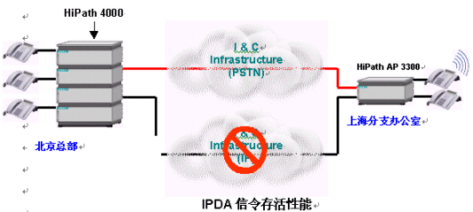 人們也許會問,IP語音(VoIP)是否足夠可靠?如果IP網(wǎng)絡(luò)上的信令通道出現(xiàn)故障,HiPath平臺仍將保證對各接入點的控制,從而提供了可靠的信令存活性能(Signaling Survivability)。在下面的圖例中,當企業(yè)IP網(wǎng)絡(luò)出現(xiàn)某些問題后,信令通道轉(zhuǎn)移到了公共交換電話網(wǎng)絡(luò)(PSTN)之上。