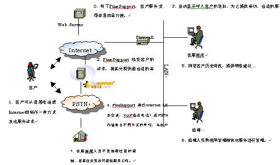 FineSupportTM網(wǎng)通呼叫中心解決方案主要由以下幾個(gè)部分組成:Media Gateway(接受來自IP網(wǎng)的網(wǎng)絡(luò)電話、傳統(tǒng)電話等呼叫,傳送給軟交換系統(tǒng))、Service Switch(軟交換系統(tǒng),負(fù)責(zé)呼叫控制)、IP IVR(存儲顧客呼叫信息,播放語音提示信息)、Soft ACD(呼叫分配服務(wù)器,可定制多種分配策略)、Web Server(負(fù)責(zé)報(bào)表管理、站點(diǎn)管理和監(jiān)控、FAQ存儲管理、留言及文本交談管理等)、Chat Server(建立交談通道)、Remote Agent(坐席工作站。通過客戶端軟件進(jìn)行客服支持)。