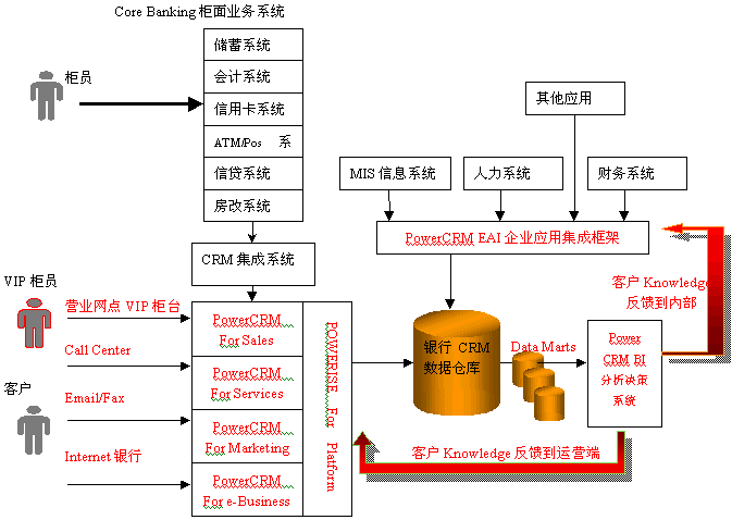 利用PowerCRM的銀行分析型CRM解決方案,對客戶信息進行全面的分析,從而挖掘出許多客戶知識,繼而制定和改進相應(yīng)的市場策略,應(yīng)用于PowerCRM運營型CRM系統(tǒng)中,更好地指導(dǎo)營銷人員為客戶服務(wù)和完善客戶服務(wù)流程;同時也需要反饋到銀行內(nèi)部系統(tǒng),用于增強銀行內(nèi)部的運營效率。