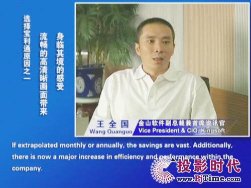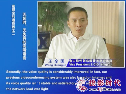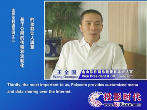 金山軟件副總裁兼首席資訊官王全國(guó)先生說(shuō)道:“對(duì)于軟件行業(yè)來(lái)說(shuō),及時(shí)、高效的溝通是保持競(jìng)爭(zhēng)優(yōu)勢(shì)的重要前提。相比之前使用的標(biāo)清產(chǎn)品,寶利通高清視頻會(huì)議系統(tǒng),提供了完全不同的體驗(yàn),流暢的高清晰畫(huà)面猶如真實(shí)的面對(duì)面溝通。而且我們公司并沒(méi)有申請(qǐng)專(zhuān)線(xiàn),所有的應(yīng)用都是基于公網(wǎng)實(shí)現(xiàn)的。另一方面,新型全中文定制菜單的運(yùn)用,令我們使用起來(lái)非常方便,這更提高了我們使用視頻通信手段實(shí)現(xiàn)異地溝通的熱情!