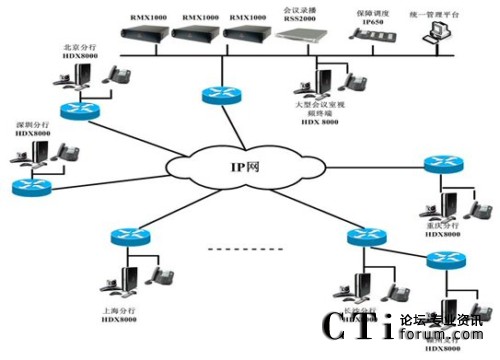 RMX1000作為多媒體多點(diǎn)處理單元,70臺(tái)HDX8006和HDX8002分布在全國(guó)各個(gè)分行作為視頻會(huì)議的接入,RSS2000服務(wù)器提供HD的會(huì)議錄制;65臺(tái)IP電話作為實(shí)時(shí)會(huì)議備份系統(tǒng);整個(gè)系統(tǒng)提供720P/60幀或1080P/30幀的會(huì)議畫面質(zhì)量,音頻達(dá)到22KHz寬帶音質(zhì),劇院級(jí)音質(zhì)享受,具備新一代高清雙流P