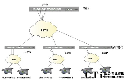 根據(jù)客戶需要在降低會議成本的前提下實現(xiàn)快速、便捷、實時的多點之間多人會議溝通的需求,我們制定了以下解決方案;系統(tǒng)利用傳統(tǒng)電話網(wǎng)絡,是客戶擁有自己的會議管理系統(tǒng);省行方面使用Polycom SS2基本型商務會議電話或普通模擬電話;各個市/縣級分行,根據(jù)自己會場的情況自選設備;