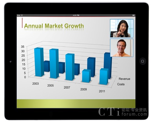 現(xiàn)在,在視頻通信需求增長、勞動(dòng)力越來越偏遠(yuǎn)以及技術(shù)進(jìn)步的推動(dòng)下,移動(dòng)視頻會議正在顯著增長。今天的企業(yè)往往在地域上越來越分散,越來越虛擬,全球遠(yuǎn)程辦公人員已超過10億。同時(shí),技術(shù)的進(jìn)步也推動(dòng)了視頻移動(dòng)社會,包括配有攝像頭的移動(dòng)平板電腦和智能手機(jī)的普及;3G、4G和Wi-Fi網(wǎng)絡(luò)的出現(xiàn);以及云服務(wù)。事實(shí)上,Gartner仍然看好多媒體平板電腦市場帶來的機(jī)會,據(jù)他們預(yù)測到2015年平板電腦將售出3.2億部,到年底,累計(jì)銷售將超過9億部。到2015年,采用視頻聊天的人數(shù)預(yù)計(jì)將增長14倍,超過1.4億人。