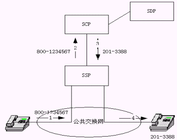 該圖示業(yè)務(wù)工作過(guò)程如下:(1)主叫用戶(hù)撥800號(hào)號(hào)碼,(2)SSP向SCP查詢(xún)800號(hào)號(hào)碼,(3)SCP查詢(xún)數(shù)據(jù)庫(kù)后向SSP送回譯碼結(jié)果(真正被叫號(hào)碼),(4)SSP連接主、被叫,振鈴。