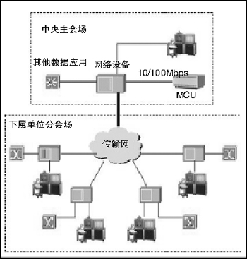 各節(jié)點(diǎn)的接入采用一條512Kbps帶寬的DDN/E1線路接入本地電信公司;在總部采用集中式接入中央電信公司,接入中心的電路帶寬應(yīng)該是多條信道捆綁的帶寬,中心節(jié)點(diǎn)交換機(jī)采用10/100Mbps與MCU相連,總部主會(huì)場的視頻終端通過接入交換機(jī)與MCU進(jìn)行通信。