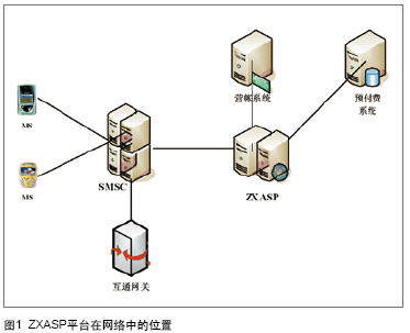 ZXASP:中興短消息增值業(yè)務(wù)平臺(tái),是一個(gè)位于SMSC后端的增值業(yè)務(wù)邏輯控制處理網(wǎng)元,它為用戶提供新型短信增值業(yè)務(wù)開戶、銷戶以及業(yè)務(wù)使用流程控制支持等相關(guān)功能。核心網(wǎng)元ZXASP分別與短信中心、營帳系統(tǒng)以及預(yù)付費(fèi)系統(tǒng)進(jìn)行連接,以實(shí)現(xiàn)對(duì)用戶簽約多種增值業(yè)務(wù)情況下的服務(wù)支持。如圖1。