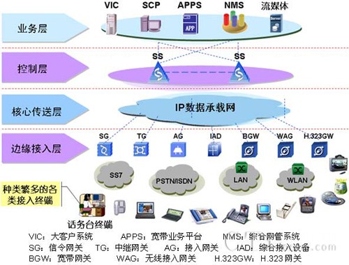 邊緣接入層:主要指與現(xiàn)有網(wǎng)絡(luò)相關(guān)的各種網(wǎng)關(guān)和新型接入終端設(shè)備,完成與現(xiàn)有各種類(lèi)型的通信網(wǎng)絡(luò)的互通并提供各類(lèi)通信終端(如模擬話機(jī)、SIP Phone、PC Phone、可視終端、智能終端等)到IP核心層的接入。